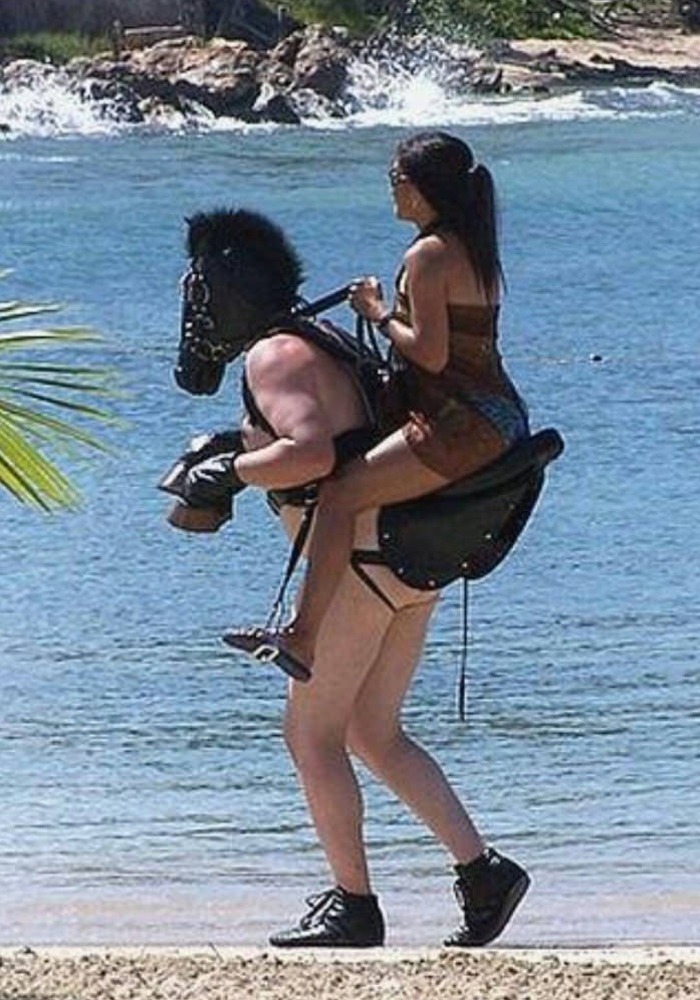 There are so many things wrong with this picture. The girl is literally riding that man like a horse. The guy is wearing a strange horse costume, but honestly, it looks more like something from the movie Fifty Shades of Grey. We’re not sure if other people at the beach would get this couple’s sense of humor. They will likely be startled by them. The girls might remember this photo for many years, but we’re sure this is one photo the guy will want to forget in the future.