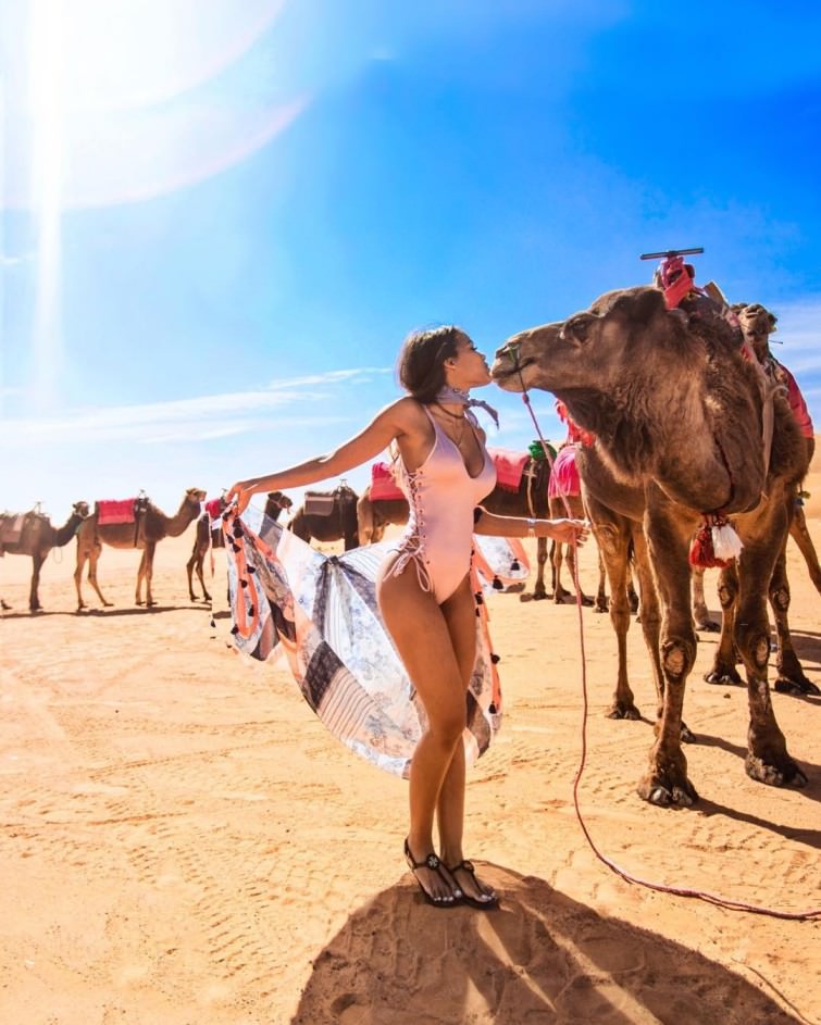 It seems like all the camels are ready to kiss her. This situation feels off. We can’t quite grasp what’s happening, but it appears to be a professional photo shoot rather than a private one. The atmosphere resembles a desert rather than a beach, and with the presence of camels, it’s likely the photo was taken in a desert setting. Whatever the case, it’s an excellent photo. The scene is well-composed, the background is set just right, the girl is dressed beautifully, and it all comes together perfectly.